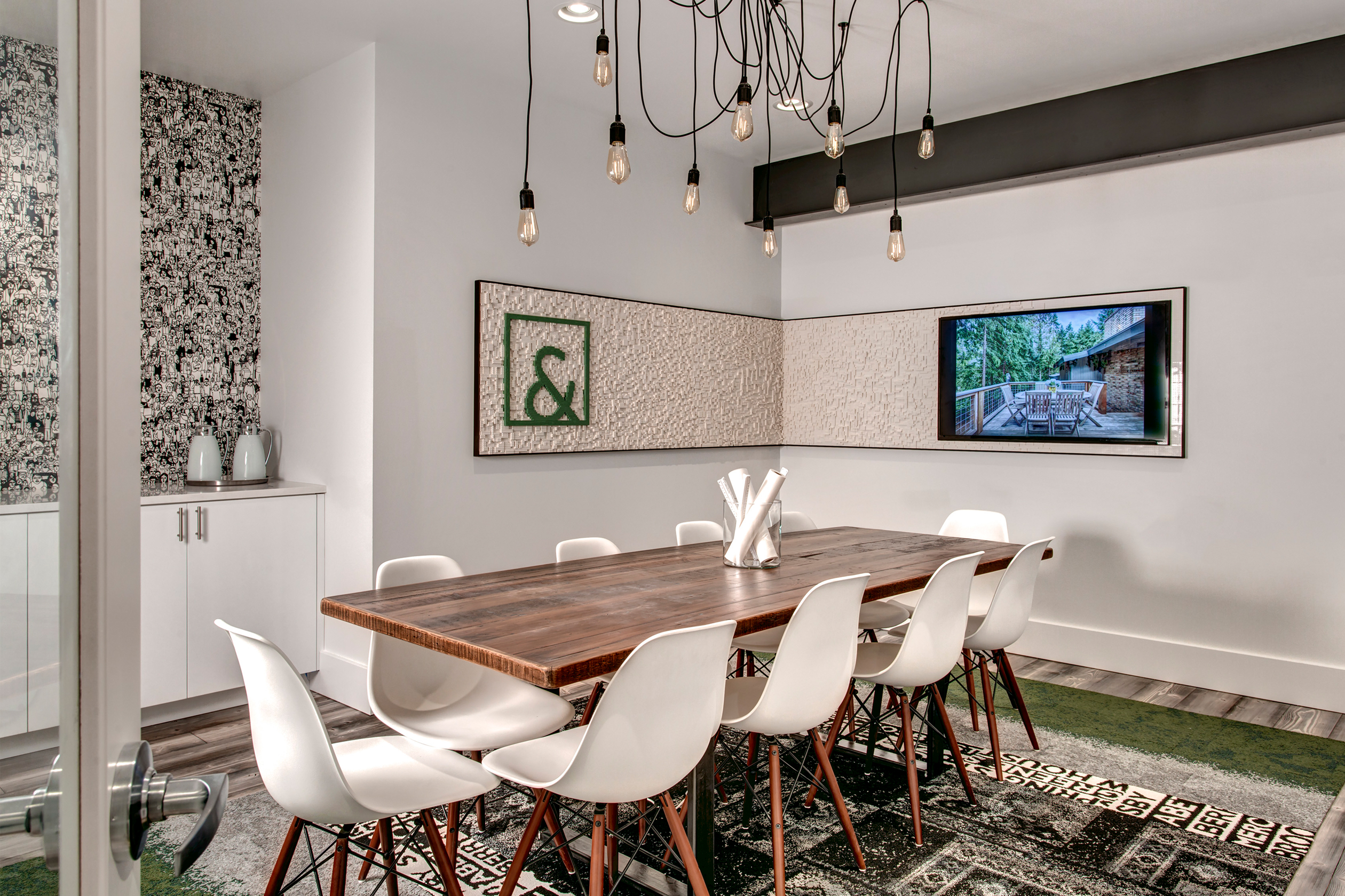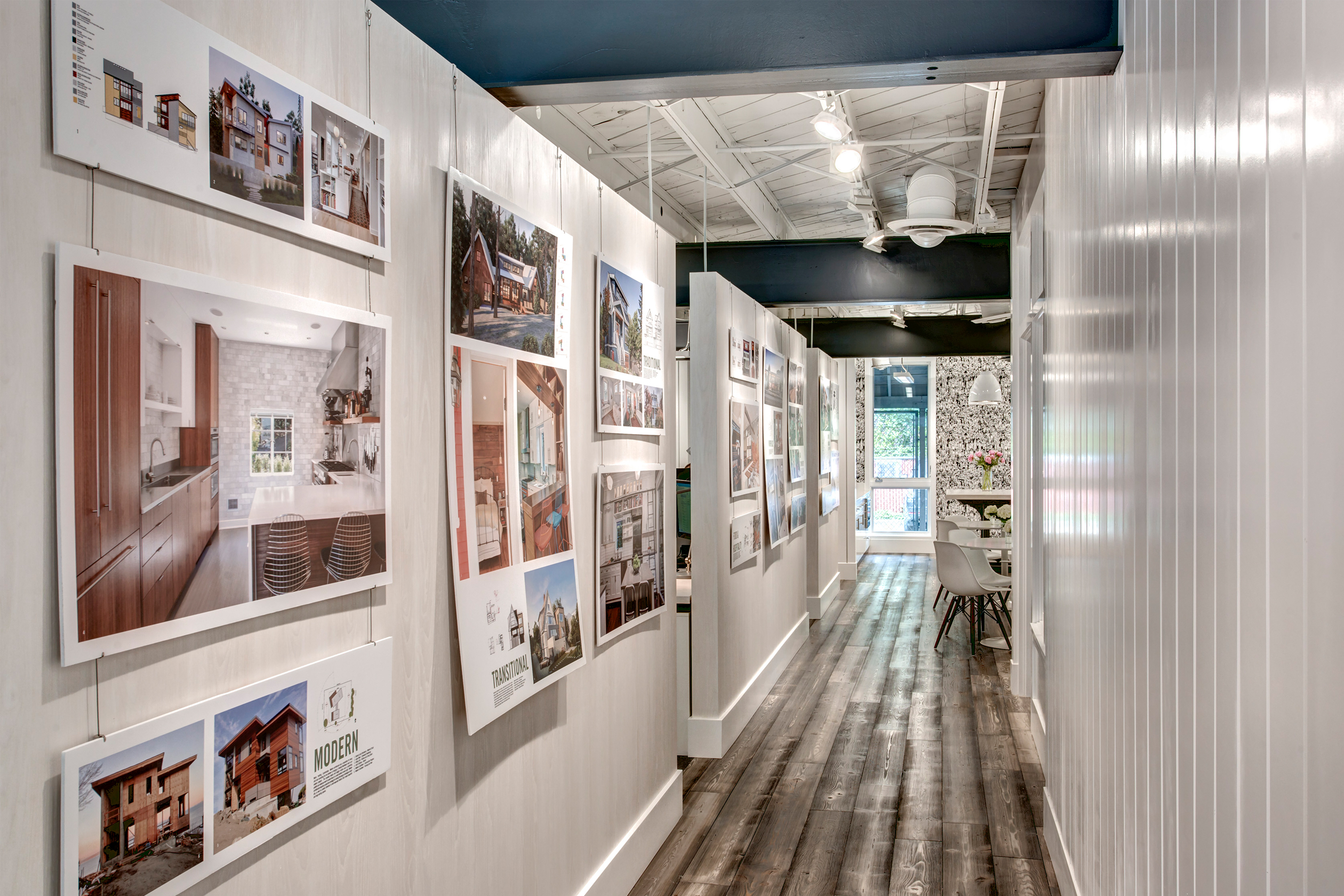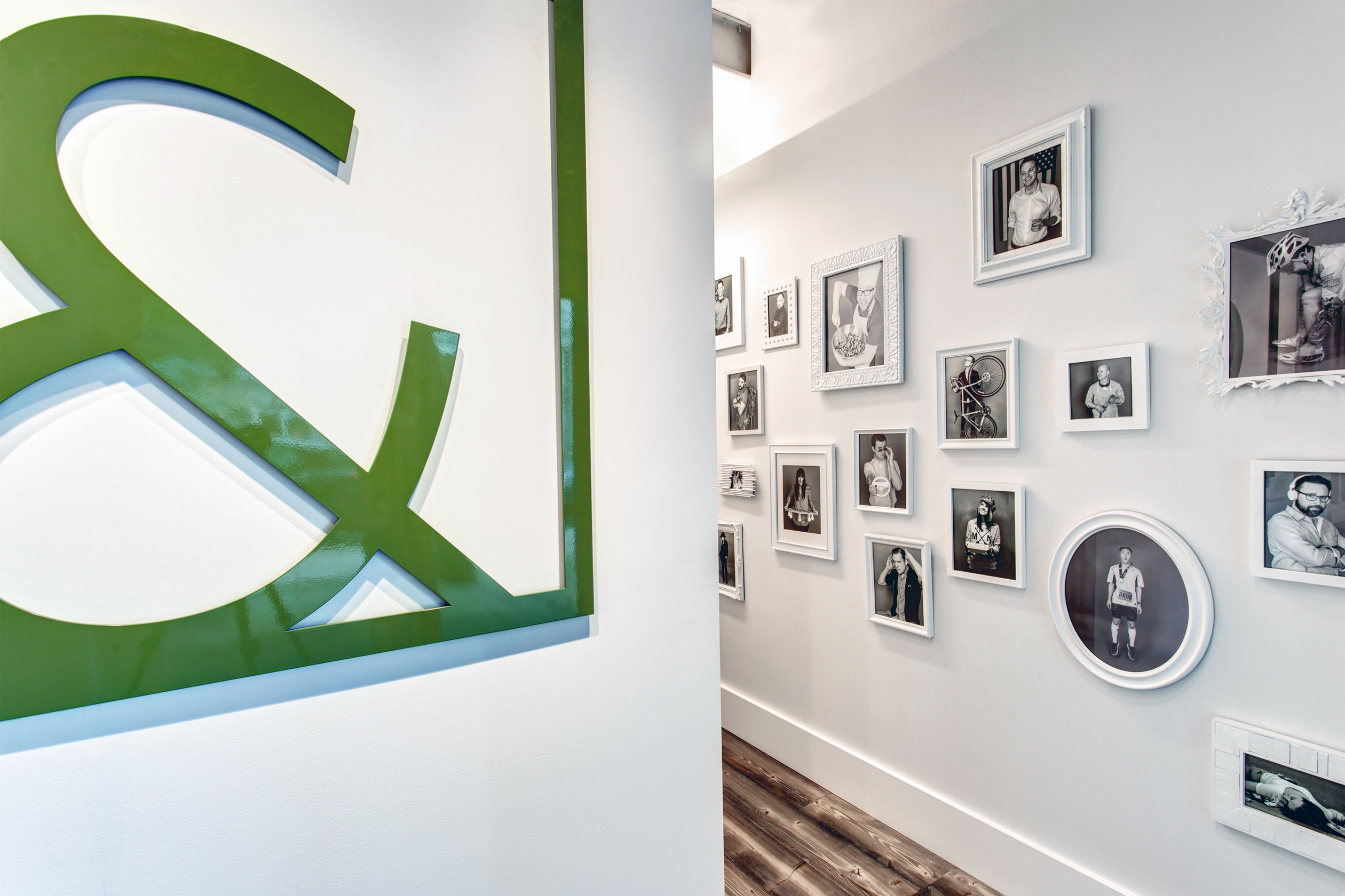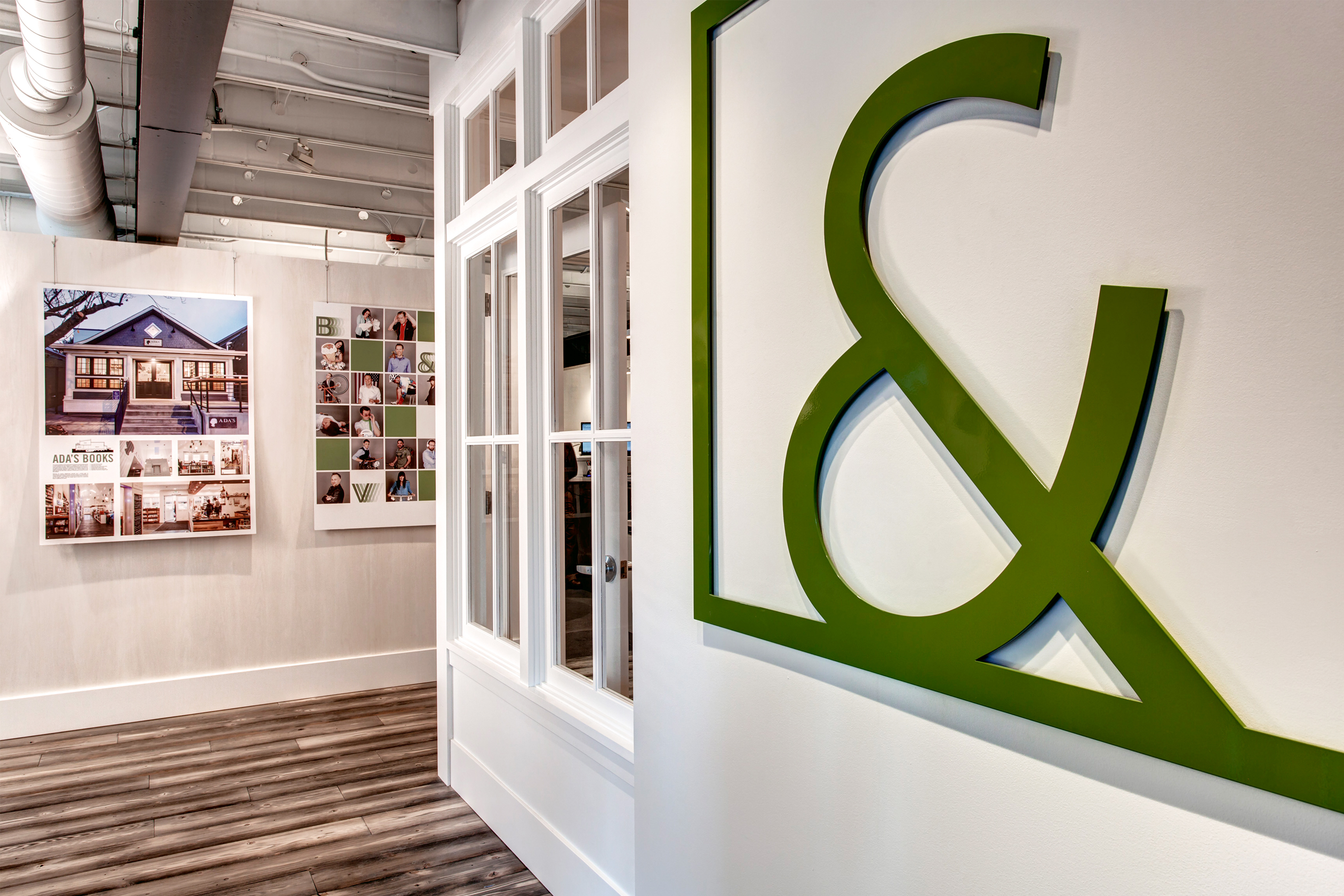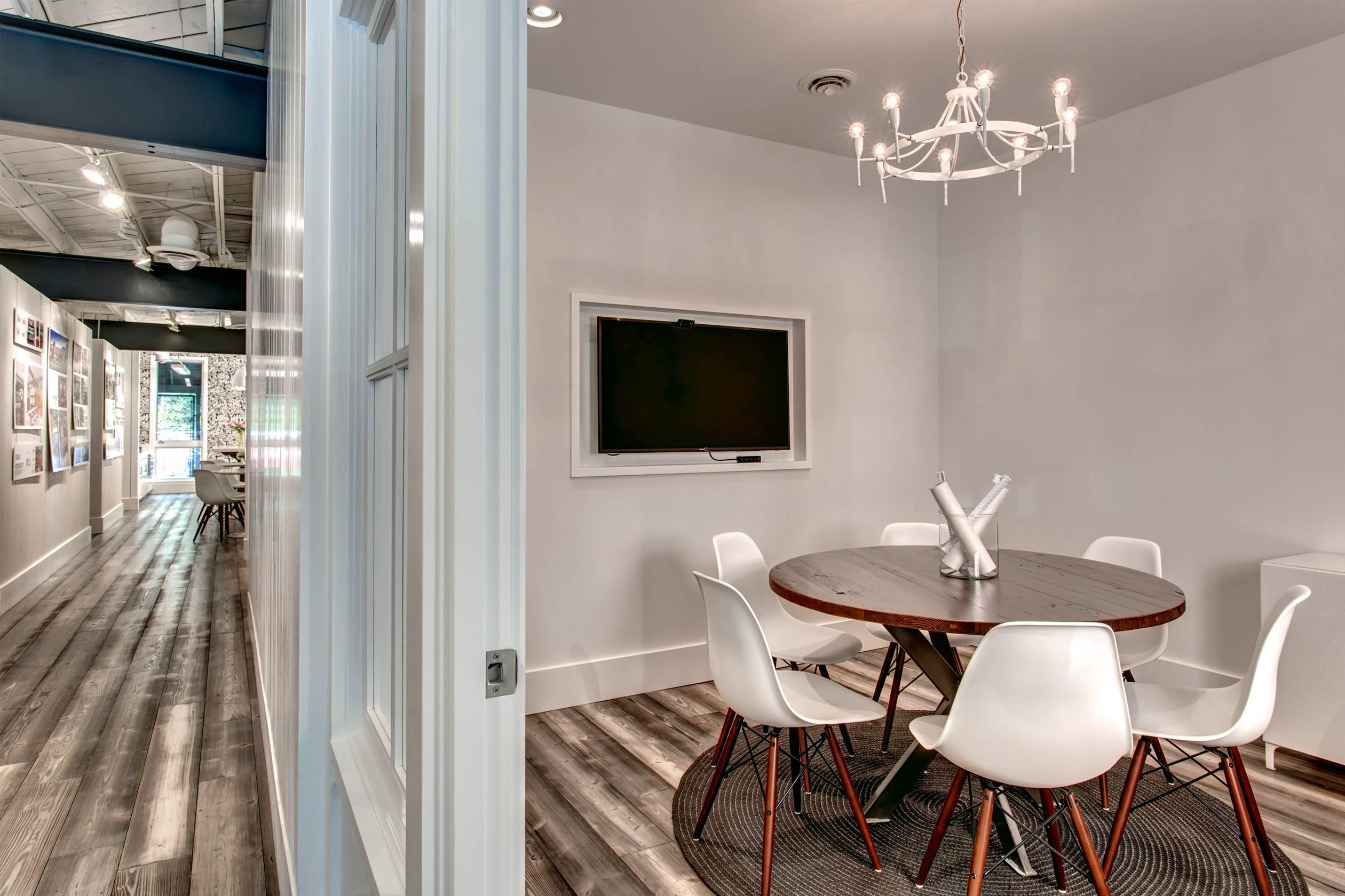 The main floor is anchored by a whitewashed feature wall, which divides our more public spaces – such as the conference rooms, gallery, and kitchen – from our more private office space.