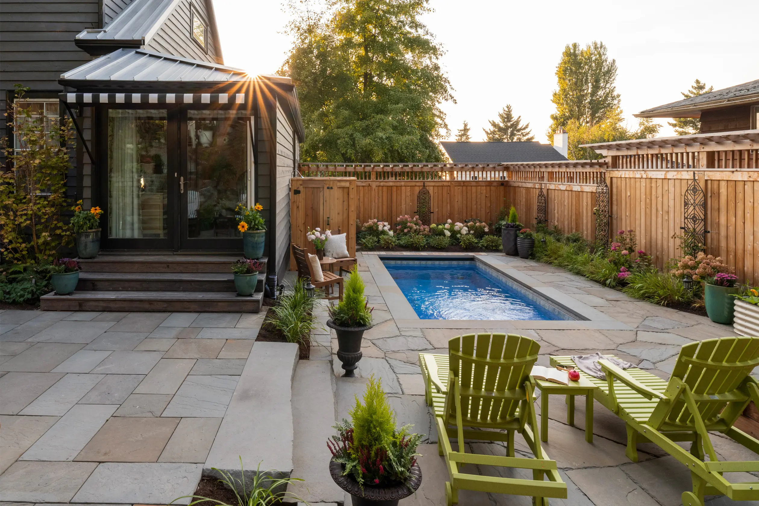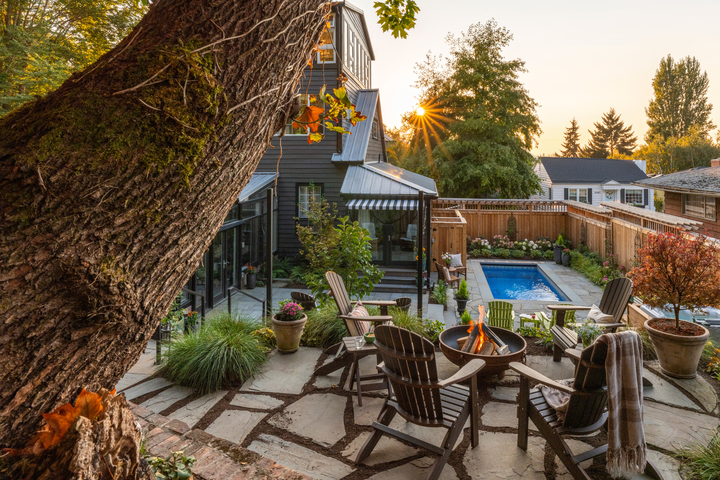 The richly-programmed series of outdoor rooms for this fully remodeled property includes a right-sized, secluded lap pool, a rarity in the Seattle area. Glass House Reverie | Photo by Kara Mercer.