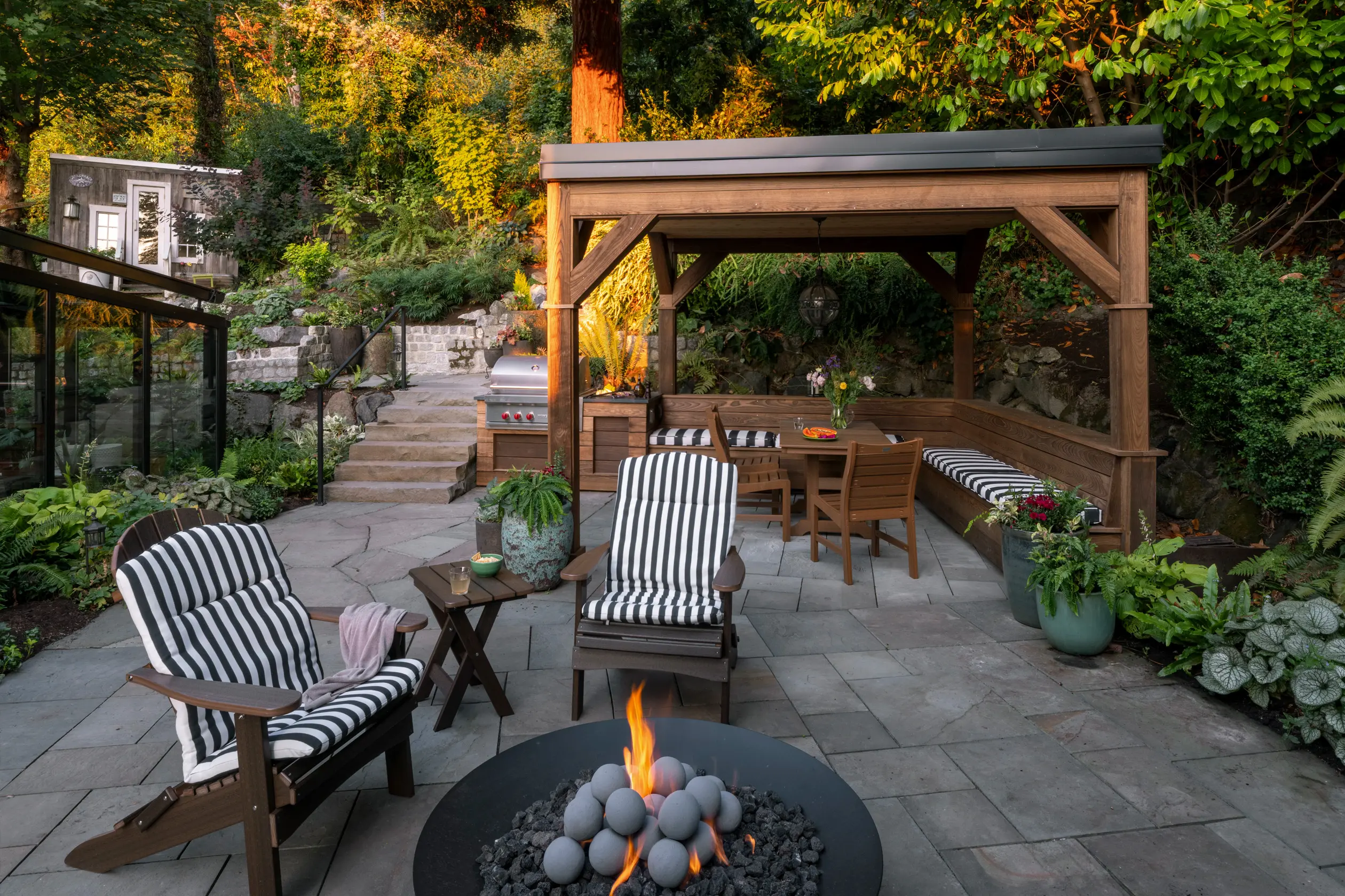 An outdoor dining area is sheltered by a cabana tucked into the forested hillside, with a gas fire pit nearby for warming up on chilly nights. Glass House Reverie | Photo by Kara Mercer.