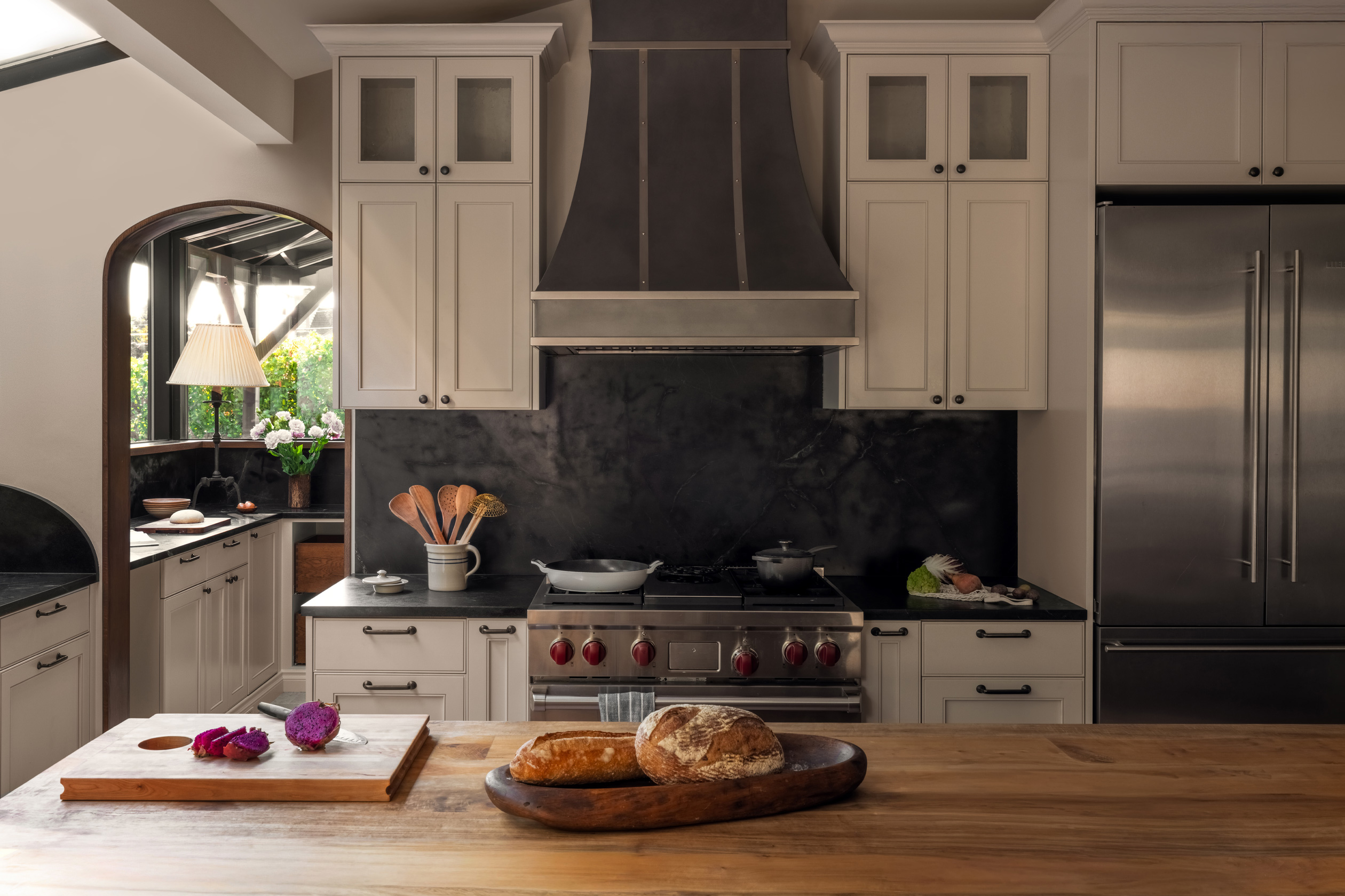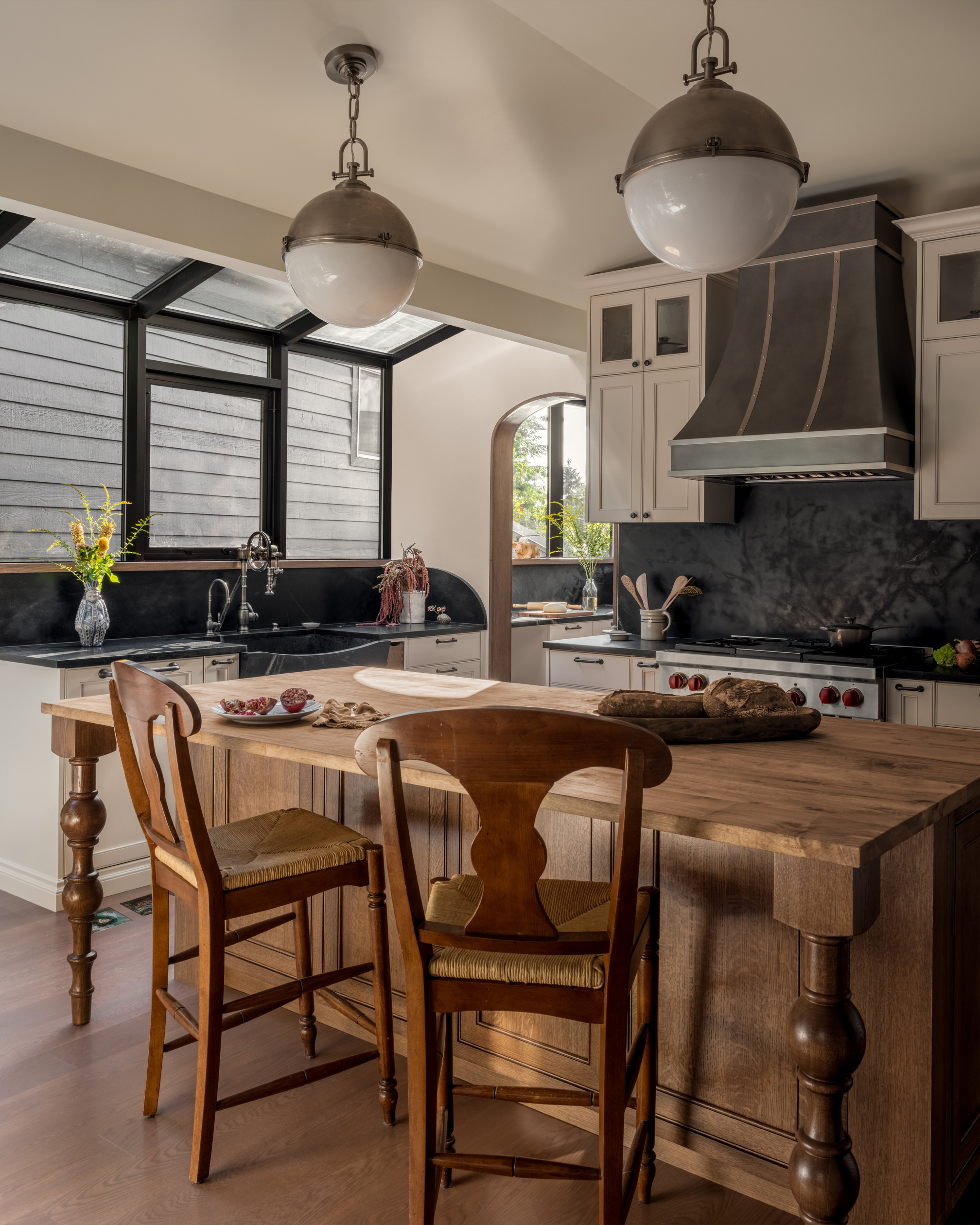 Incorporating natural materials was also important to the homeowner, seen in the reclaimed myrtle wood butcher block island and the soapstone countertops and backsplash, which returns to the counter with a gentle arch, mirroring the wood-clad archway to the butler’s pantry.