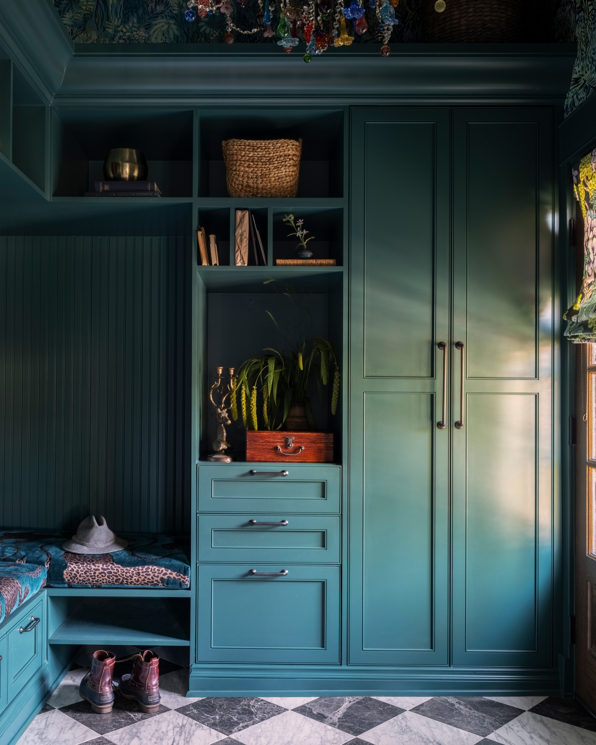 Blending old and new, salvaged 16th century pocket doors pair with carefully-detailed new built-ins designed to maximize every inch of this mudroom, all bathed in a deep, saturated teal blue. Glass House Reverie | Photo by Kara Mercer.