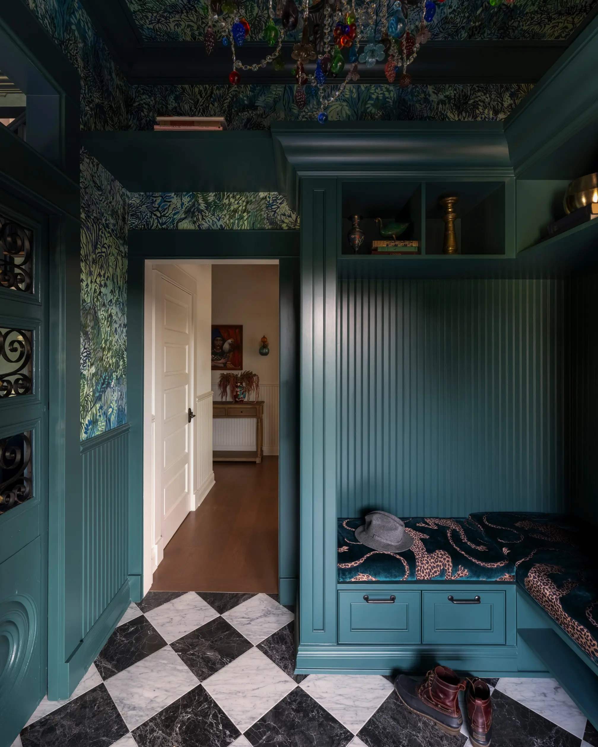 Rising up from the checkered black and white marble floor, custom built-ins in a rich blue teal define this mudroom featuring delightful accents such as the cheetah upholstery and chandelier of Italian glass baubles. Glass House Reverie | Photo by Kara Mercer.