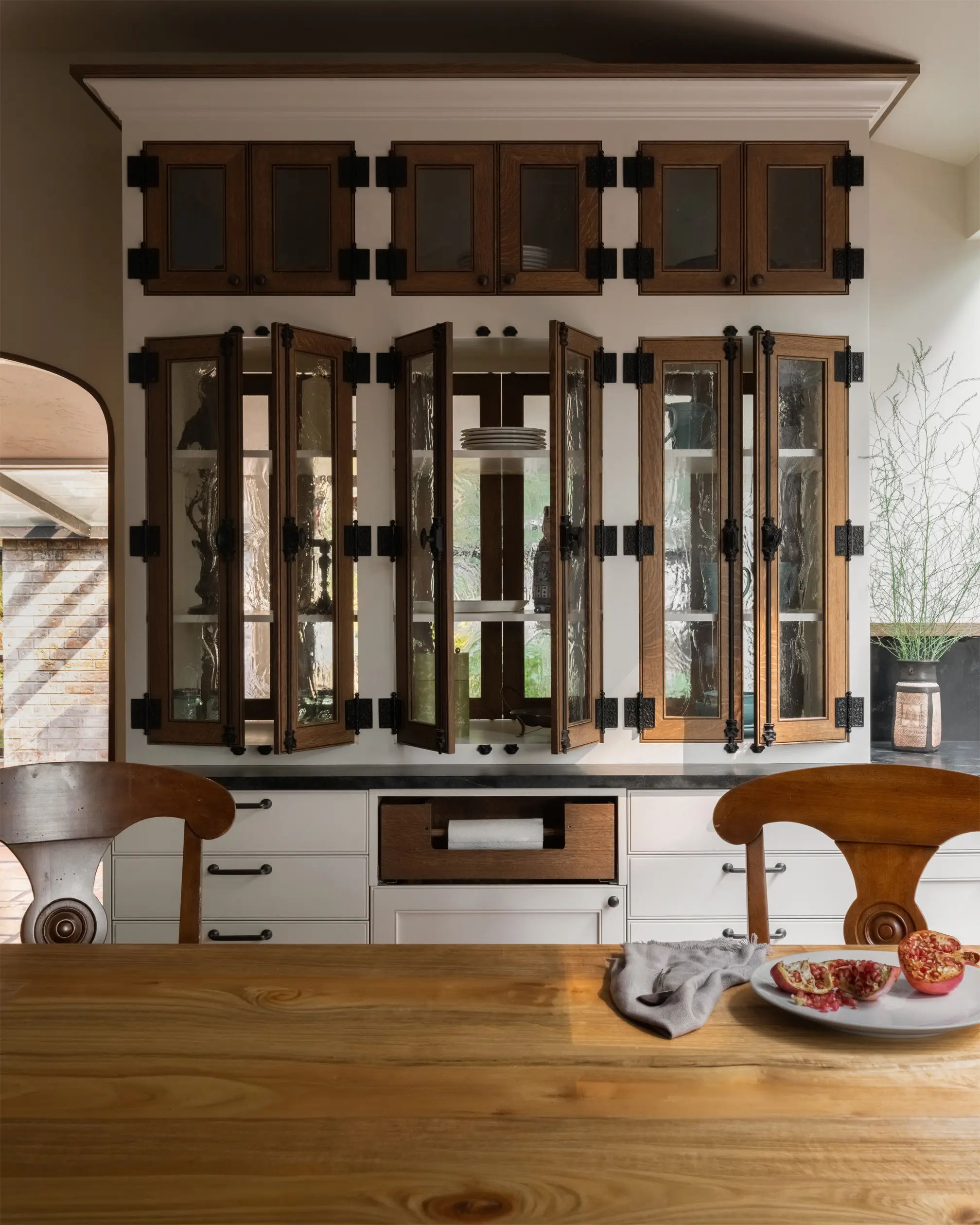 On the dining room side of the two-way cabinet, a lower bank of doors acts as a curio cabinet, while the upper section allows flatware to be easily accessed from both sides. Glass House Reverie | Photo by Kara Mercer.