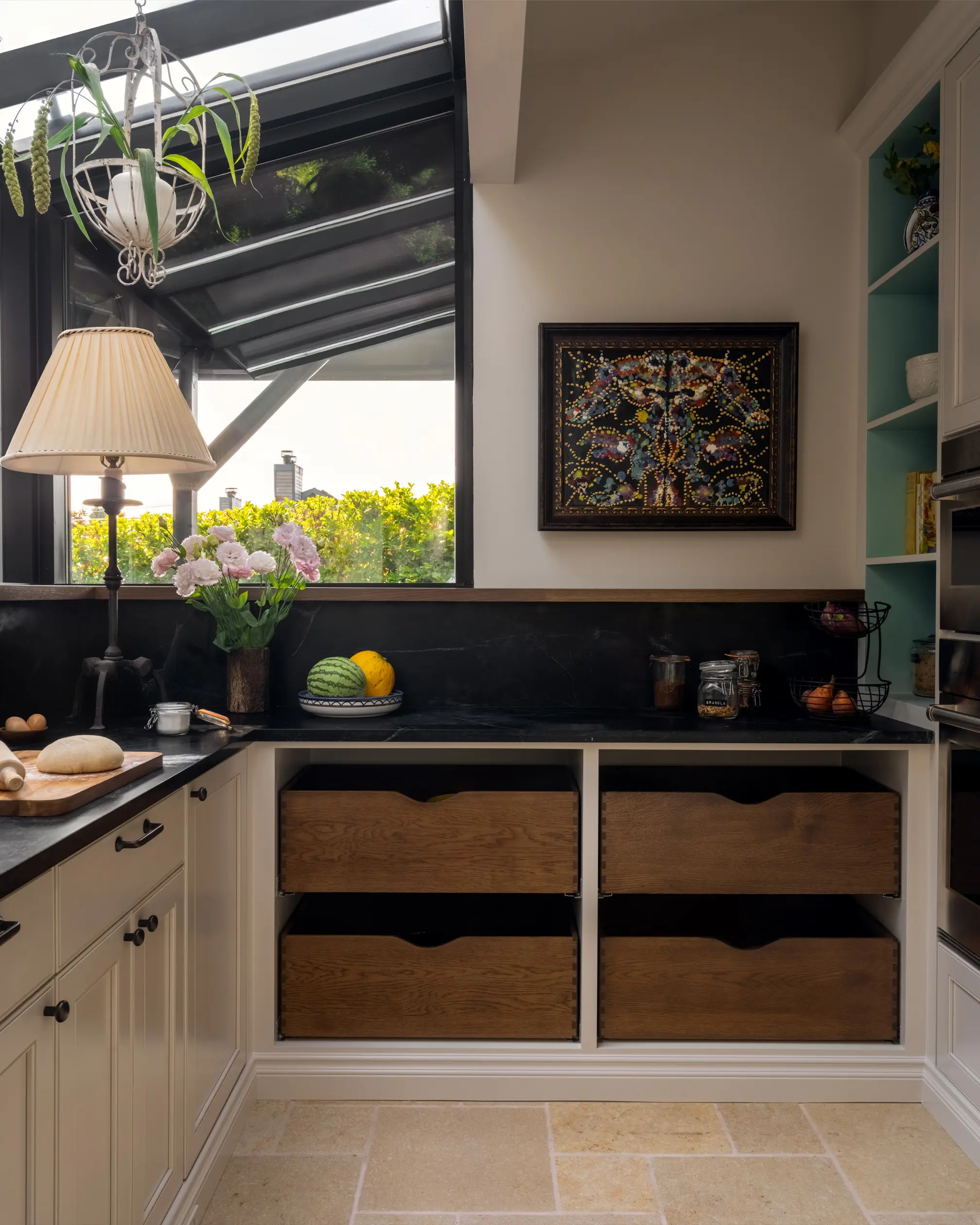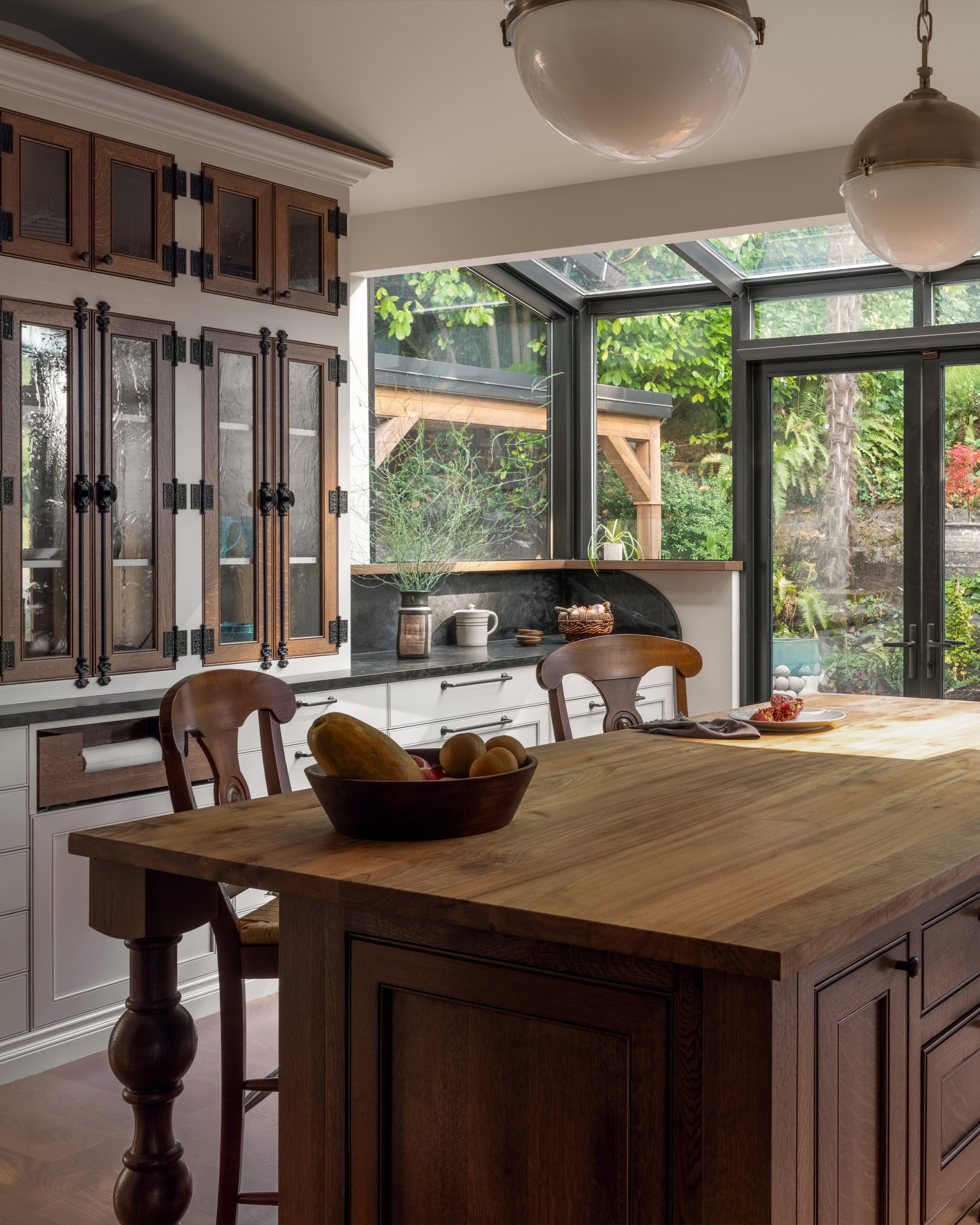 This newly capacious kitchen feels rich with materiality, yet grounded. Working with an existing glass solarium, addressing the overall functionality of the space while tailoring it to the homeowner’s lifestyle was paramount. Fittingly, the result included extending the solarium, creating a light-filled kitchen and dining room where custom details abound.