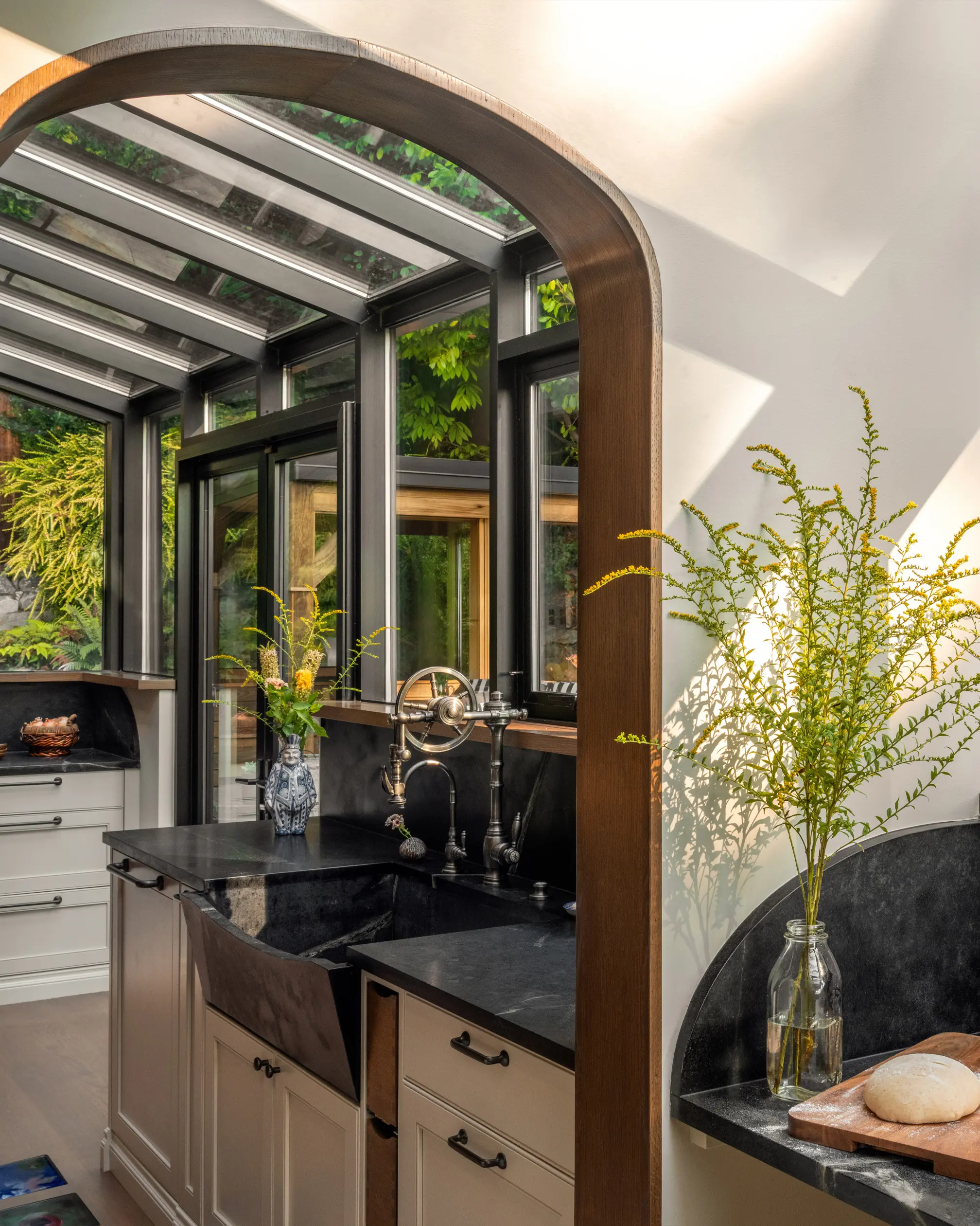 Gentle arches, seen in the wood-clad doorway and the return of the soapstone backsplash soften the harder angles of the solarium. Glass House Reverie | Photo by Kara Mercer.
