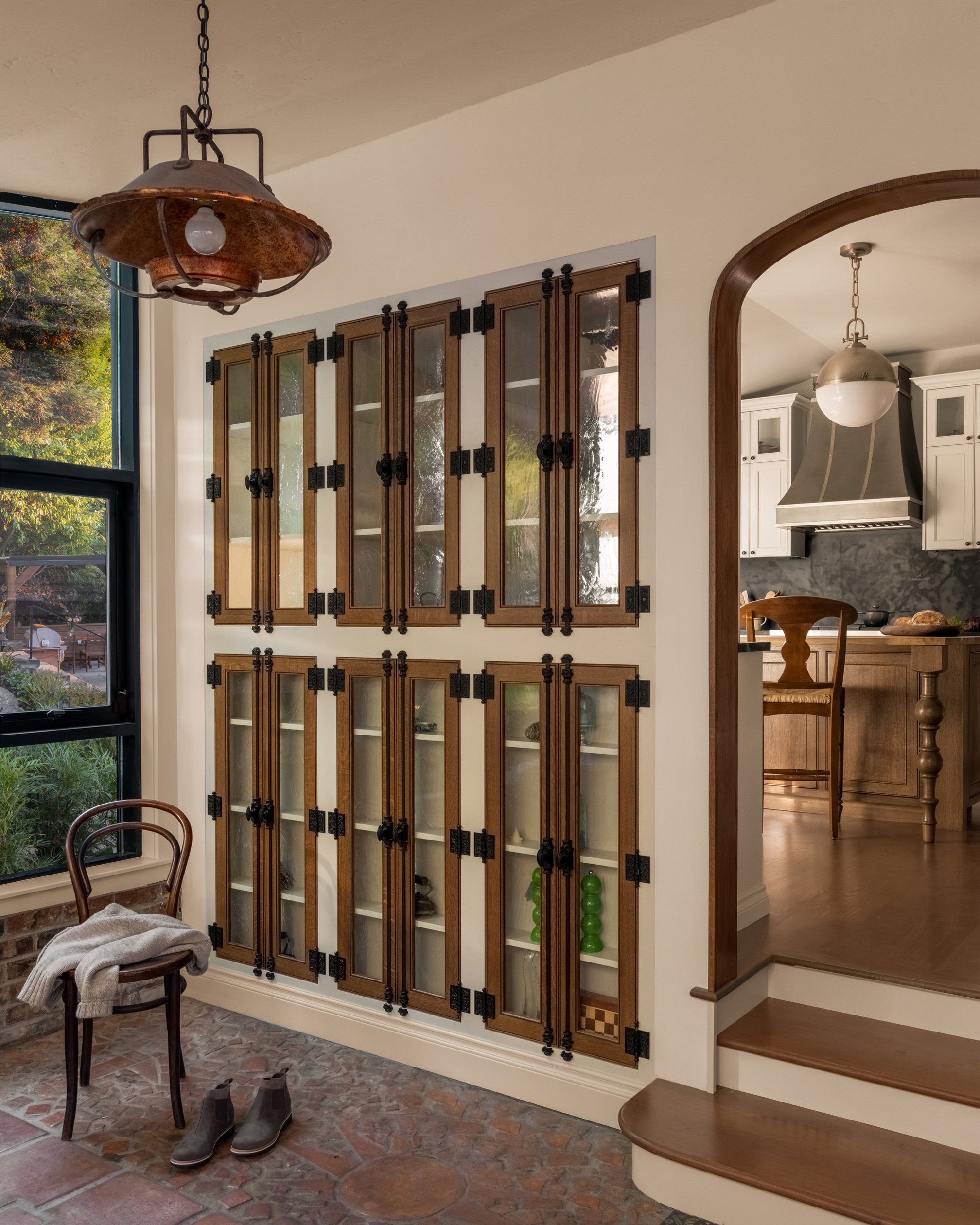 Vintage pieces, such as the pocket doors that separate the mudroom from an informal sitting room, juxtapose the new, custom casework. Salvaged from Louisiana, these doors originated from a 16th century chateau. Sanded and painted a matching blue teal, they add a character all their own to the small space.