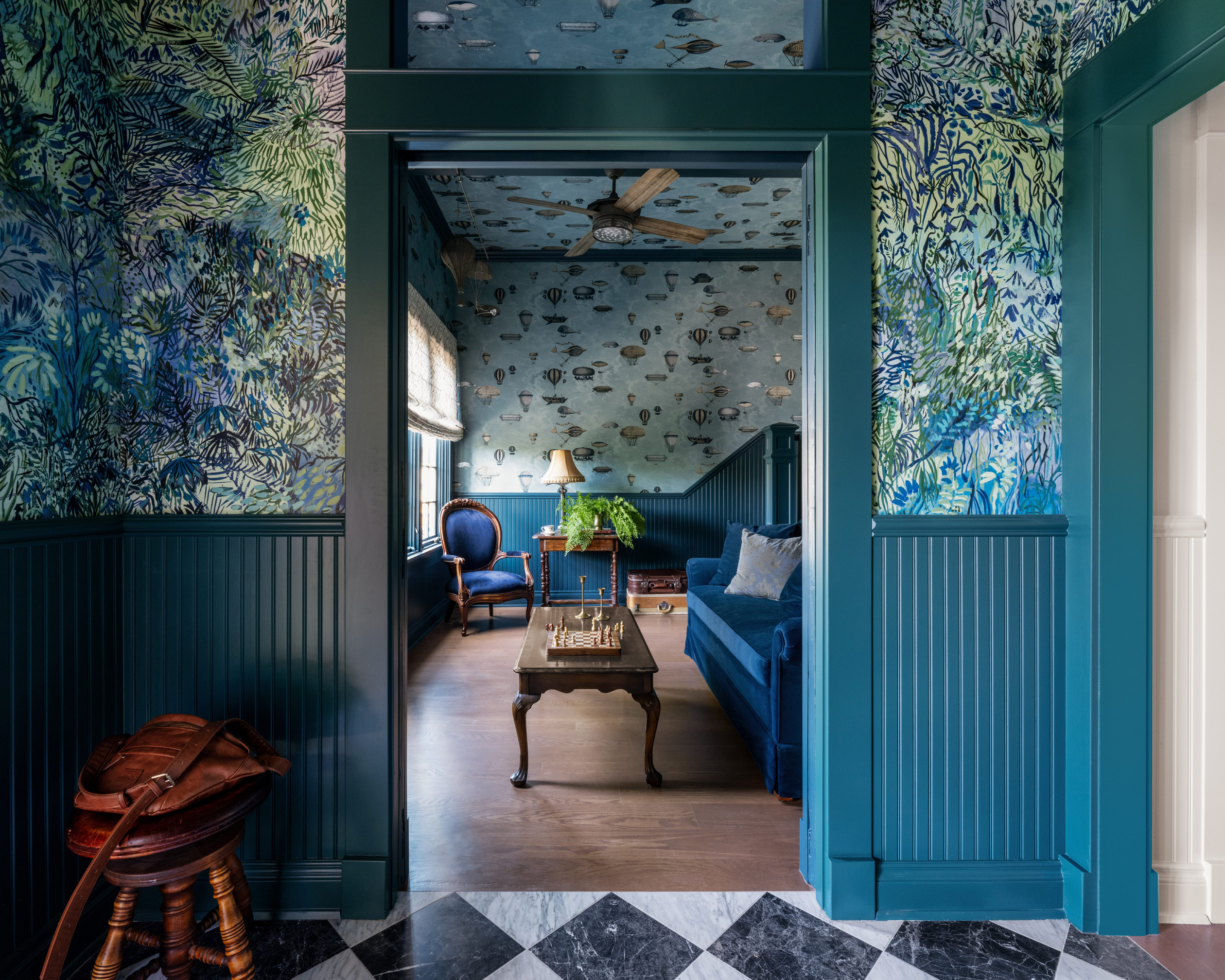In this intricately remodeled home, a sitting room just beyond the mudroom pays homage to the home’s early days as a circus owner’s training grounds. Covering all four walls and the ceiling, the room’s whimsical dirigible wallpaper envelops the space with a playful vibe in moody blues.