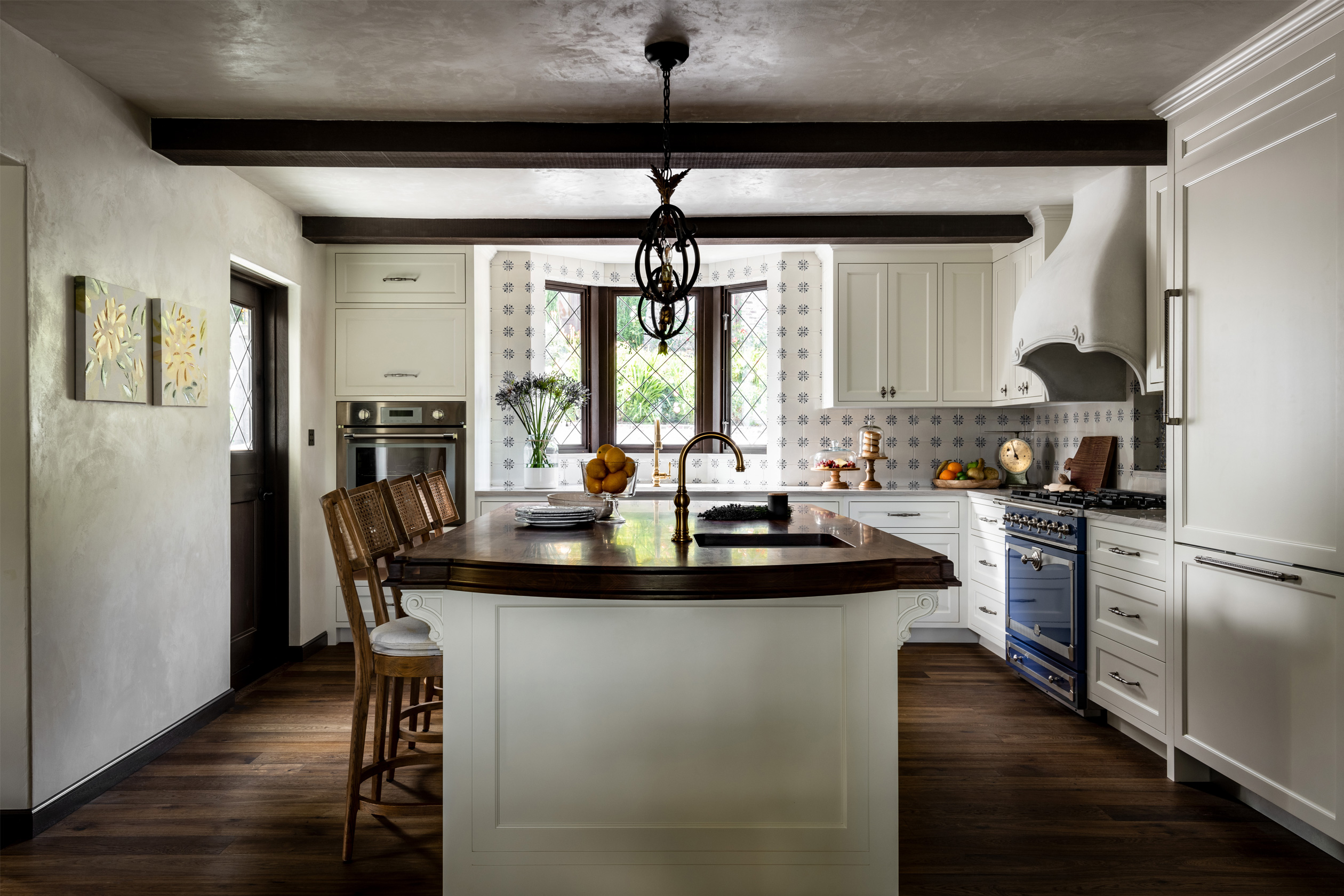 A large island anchors the kitchen, its richly-toned wood countertop bringing a warm balance to the white kitchen, complementing the dark beams above. Laurelhurst Storybook Residence | Photo by Andrew Giammarco.