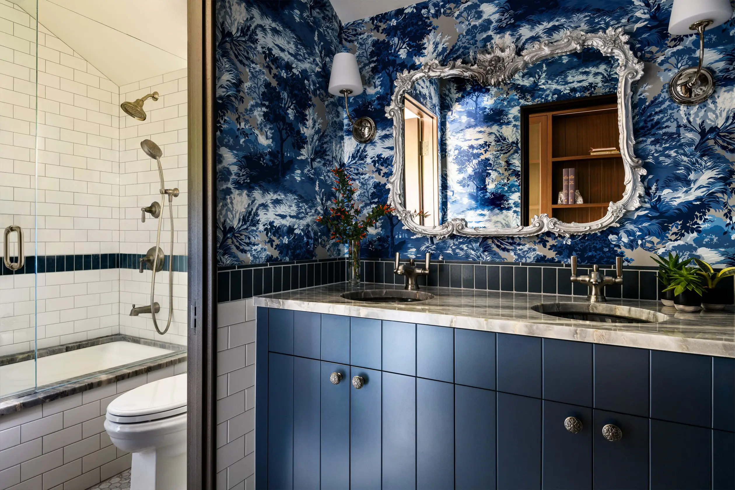 The hall bath — featuring yet another bold wallpaper in the home’s signature blue — provides plenty of room for visiting grandkids to share, with double sinks and a pocket door to separate functions. Laurelhurst Storybook Residence | Photo by Andrew Giammarco.