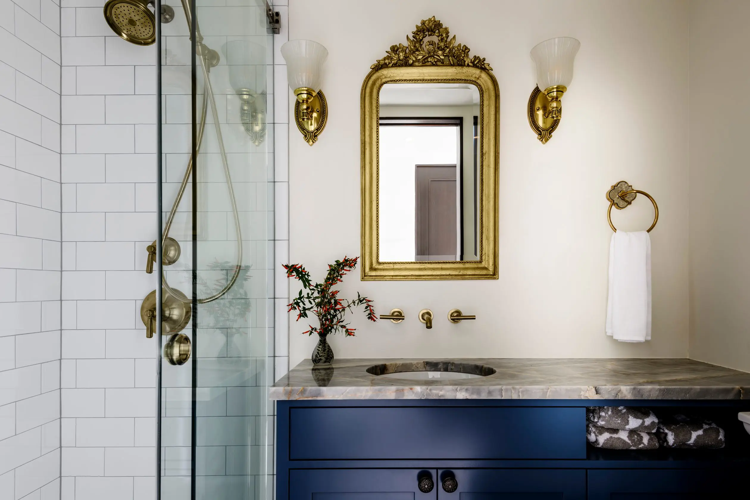 Golden accents and traditional filigree enliven this guest bathroom. Laurelhurst Storybook Residence | Photo by Andrew Giammarco.