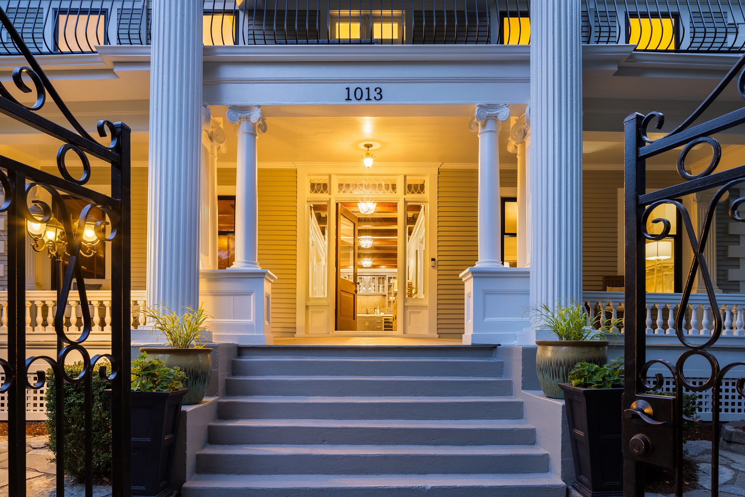 The large, formal front porch with its grand columns and craft woodwork beckons visitors in with warm lighting and lush plantings. Volunteer Park Residence Refresh | Photo by Baylee Reinert