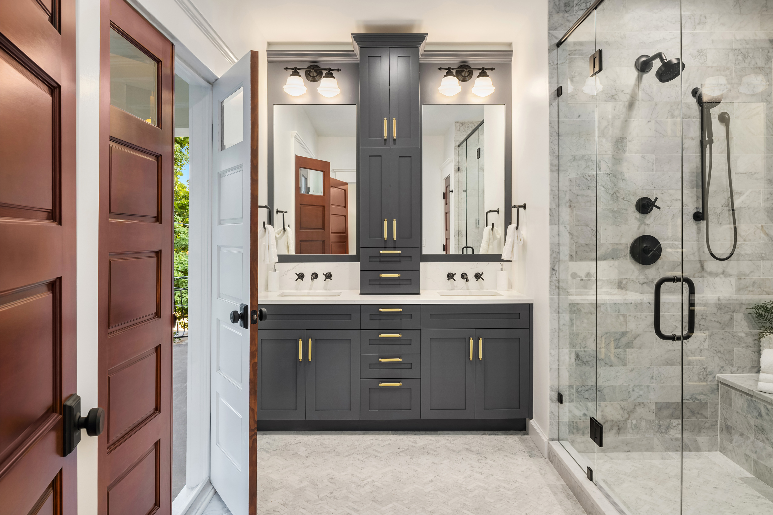 The remaining hall bathroom on the second floor received a cosmetic update in a chic black-and-white color scheme with a spacious, traditional black vanity capped with a glossy natural stone countertop. On the third floor, the guest bathroom was fully remodeled in the same color scheme, visually connecting these support spaces. The new layout includes a carefully crafted custom shower that makes clever use of a tight spot under the sloped ceiling. Hidden storage pairs with the large vanity to ensure guests or residents have everything they may need close at hand.