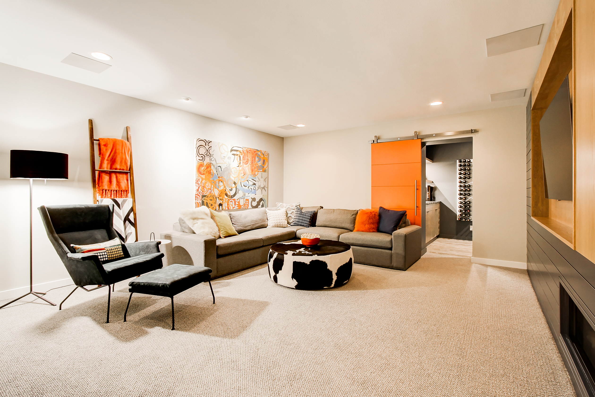 In the basement, two formerly awkward spaces are now refined with a custom built-in element that defines, shapes, and supports the activity of the spaces. This big design move is at once highly functional and brings a modern element to the formerly stylistically-neutral space. Large barn doors can optionally convert the office area into an extra guest room. A faux rustic wine room is now modern and clean, and a rarely-used wet bar is incorporated into a hall bath designed for easy sharing between sister and brother.